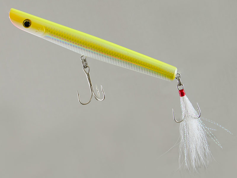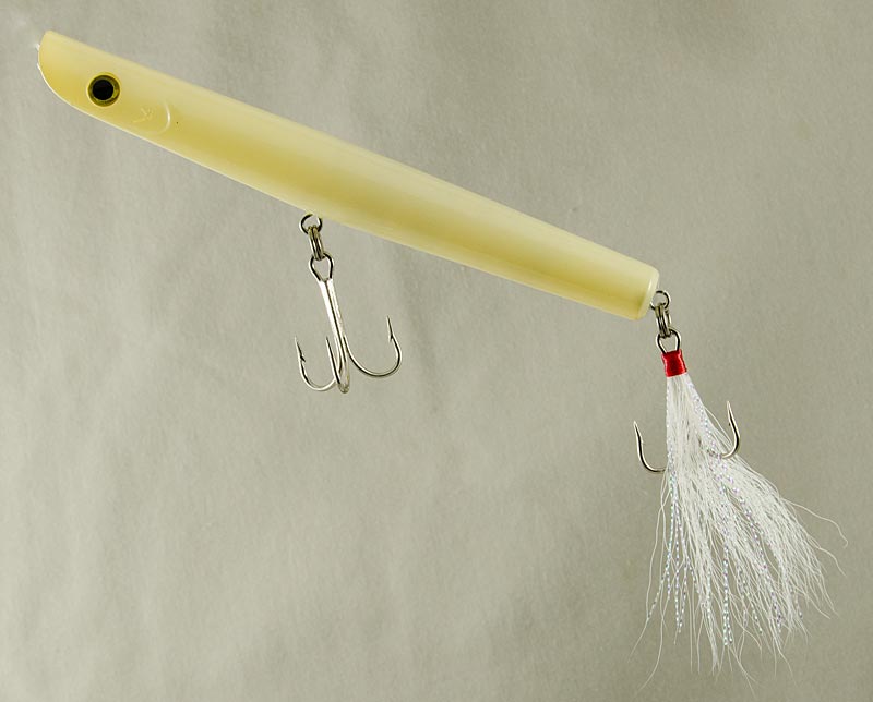 The 8 inch Skid Stik weighs 2.5 ounces and is available in Bright Yellow (shown below), Blueback Herring, Mackerel, Bay Pogy, Bone, Silverside and Sand Eel. For the Musky and Pike fisherman, the 8 inch Skid Stik is also available in Golden Shiner and Yellow Perch.