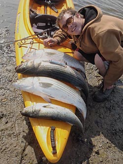 I had been using my kayak as a fishing platform for a few years on local harbors and bays while using different lures and techniques for Striped Bass and Bluefish. The lures have ranged from softbaits, swimming plugs, jigs, metals, and top water poppers. I settled on using topwater poppers because I was fishing in fairly shallow water and also seemed to receive more feedback from the topwater lures as evidenced by the follows, swirls, and missed strikes from Striped Bass. In the very least I knew the fish were down there as opposed to an unseen fish looking at my swimming plug three feet under the water but not striking it. It was frustrating to see how many big, finicky fish would not quite commit to eating those topwater lures. Last Spring my friend gave me a different looking top water lure called the Skid Stik to try. It popped and sprayed nicely but also had the side to side motion of some of the "walk the dog" lures. Using it I still got my share of missed strikes and swirls but these close misses were from fish that had more serious intent. My hook-up percentage seemed to go up and more fish bombed the lure. I've had many hook-ups on nice fish just a couple of feet away from the kayak after the fish had followed the lure. The Skid Stik raises fish from rocky structure and sandy bottoms in shallow or moderately deep water and really turns on fishes' appetites.